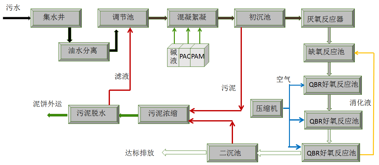 1)本废水处理工程为有机垃圾处理设备配套设施,处理有机垃圾处理过程中产生的废水,整体采用AAO法处理机工艺(即厌氧-缺氧-好氧法),而我司引进加拿大曝气系统及高效的微生物菌,针对好氧段进行优化,形成一套更具竞争力的处理工艺。
